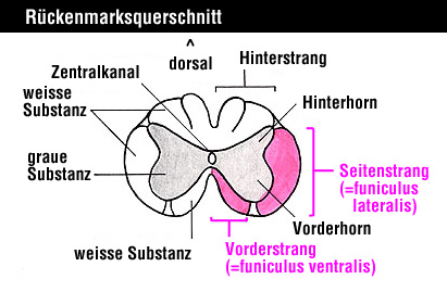 Der Vorderseitenstrang wird aus dem vorderen (funiculus ventralis) und aus dem seitlichen (funiculus lateralis) Strang der weissen Substanz des Rückenmarks gebildet.