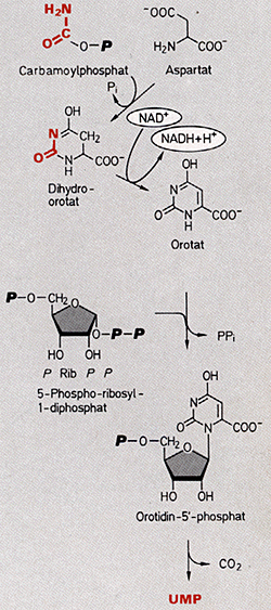 Carbamoylphosphat, das ein grosses Gruppenübertragungspotential hat, reagiert mit Aspartat zu Carbamoyl-Aspartat, das in einer Gleichgewichtsreaktion zu Dihydroorotat zyklisiert (Enzym: Aspartat-Transcarbamoylase). Dieses wird zu Orotat dehydriert (Enzym: Dihydroorotase).