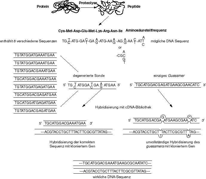 - Ist die Aminosäuresequenz des Proteins, das vom gesuchten Gen codiert wird, bekannt, kann man anhand des genetischen Codes die Nucleotidsequenz des dazugehörigen Gens ableiten. Das künstliche Gen, das so synthetisiert wird, ist nur teilweise komplementär zur gesuchten DNA, da eine Aminosäure oft von mehreren Codons bestimmt wird. Bsp: Die Codons für die Aminosäure Alanin sind GCA, GCT, GCG und GCC. Zwei der drei Nucleotide im Codon für Alanin können mit Sicherheit vorhergesagt werden. Ein künstlich erzeugtes Gen hat in der Regel genügend Aehnlichkeit, um als Sonde eingesetzt werden zu können:
