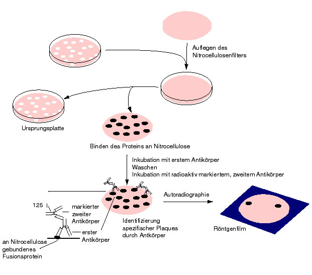 Man identifiziert mit Antikörpern das Protein, das vom gesuchten Gen codiert wird. Voraussetzung: Das Gen muss von der transformierten Zelle exprimiert werden.