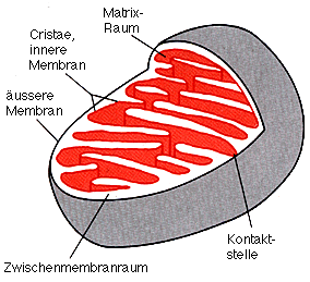 In einer Zelle finden wir gewöhnlich 100-1000 Mitochondrien, die einen Durchmesser von 0,2 - 1 µm haben. Es sind Organellen der Zellatmung, deren Funktion in der Umwandlung von Nahrungsstoffen, wie Kohlenhydrate, Fette etc in brauchbare Energie liegt. Sie sind also gewissermassen die "Kraftwerke der Zelle". Über die Enzyme der Atmungskette und damit der oxidativen Phosphorylierung wird ATP synthetisiert. Es handelt sich dabei um eine Folge von Elektronen-Transfer-Reaktionen, die einen H+-Gradienten zwischen der Aussen- und der Innenseite der inneren mitochondrialen Membran schaffen. Dieser H+-Gradient dient dazu, die ATP-Synthese anzutreiben. ATP ist der Hauptenergieträger in einer lebenden Zelle.