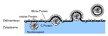 Nachkommenviren können am Ort des Zusammenbaus riesige intrazelluläre Aggregate bilden, welche nach dem Absterben und Lysieren der Wirtszelle freigesetzt werden. Gewisse Viren (z.B. Influenzavirus) synthetisieren virus-spezifische Membranproteine, welche in die Plasmamembran der Wirtszelle integrieren und später das Capsid binden. Das Nachkommenvirus tritt dann durch die Membran aus, wobei es ein Stück dieser Membran mitnimmt: