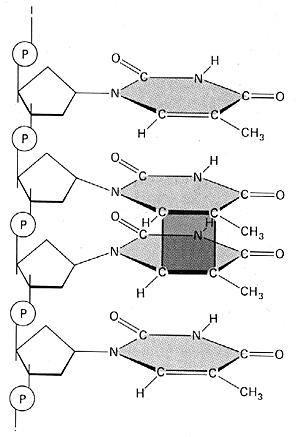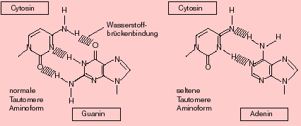 Die in der DNA vorkommenden Basen tragen unter anderem Amino- und Ketogruppen. Sie können aber in seltenen Fällen intramolekulare Umlagerungsreaktionen erfahren und in der Imino- oder Enolform vorliegen. In diesem Fall ändern sich die Paarungseigenschaften: So paart z.B. Cytosin nicht mehr mit Guanin, sondern mit Adenin! (Formel zeigen)