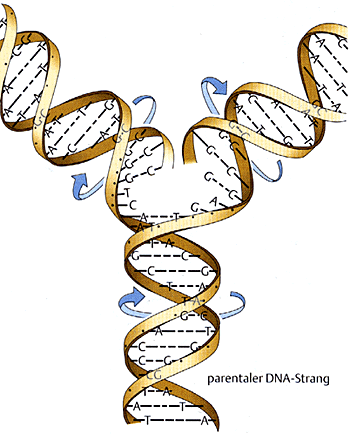Hinweis: Dieses Kapitel behandelt das Thema der Replikation. Jede Zelle, die sich aus Gründen der Fortpflanzung oder des Wachstums eines Organismus teilen muss, repliziert, das heisst verdoppelt, ihr gesamtes Erbgut, damit jede Tochterzelle einen kompleten "Schriftsatz" der genetischen Informationen erhält. Dieser Vorgang verlangt eine enorme Exaktheit, da schon die kleinsten Veränderungen der Basenabfolge der DNA gravierende Folgen haben können. Daraus resultierende mögliche Schäden sind im Kapitel "Mutation, Mutagenese und Reparaturmechanismen" beschrieben.