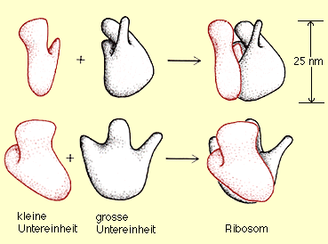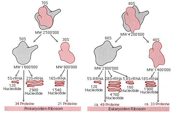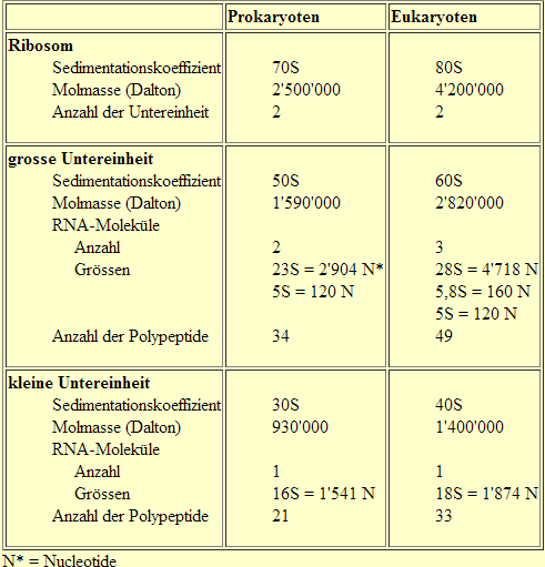 Folgende Tabelle stellt die Zusammensetzung prokaryotischer Ribosomen derjenigen von Eukaryoten gegenüber: