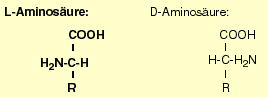 AS enthalten eine saure Carboxy- (COOH) und eine basische Aminogruppe (NH2) am a -Kohlenstoff-Atom, welches ausserdem mit einem Wasserstoffatom (H) und einem von AS zu AS verschiedenen Rest (R) verknüpft ist. Das a -C-Atom ist also asymmetrisch substituiert. Von den beiden enantiomeren Formen weisen alle in Proteinen vorkommenden AS die gleiche Stereochemie auf. Sie weisen die S-Konfiguration auf und gehören somit zur sogenannten L-Reihe: