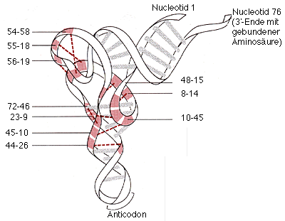 Eine tRNA besteht aus einem linearen Strang aus 70 - 90 Nukleotiden und zeichnet sich durch ihre besondere Faltung aus, welche für ihre Aufgabe als Adapter von entscheidender Bedeutung ist: Vier kleinere Abschnitte bilden durch intramolekulare Basenpaarung eine Doppelhelixstruktur aus, so dass die tRNA eine Sekundärstruktur erhält, die einem "Kleeblatt" gleicht. Eine geringe Anzahl Basenwechselwirkungen formen die tRNA in ihre Tertiärstruktur. Sie erinnert an einen Haken oder ein "L":
