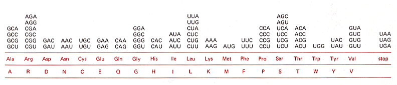 In der Translation wird die Basensequenz der mRNA in die Aminosäurensequenz eines Proteins übersetzt: Immer drei aufeinanderfolgende Basen bilden ein Codewort. Der genetische Code ist also eine Schrift aus 4 "Buchstaben" (den vier Basen Adenin, Guanin, Cytosin und Uracil), mit denen "Wörter" aus 3 Buchstaben Länge gebildet werden können. Es sind somit 4 hoch 3 = 64 verschiedene Basentripletts oder Codons möglich (Achtung: in der Abbildung fehlt UGG=Tryptophan):