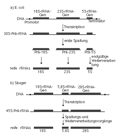 Die verschieden grossen rRNA-Moleküle müssen in etwa gleicher Anzahl synthetisiert werden. Die Synthese gleicher Mengen aller rRNA-Moleküle lässt sich dadurch gewährleisten, dass ein vollständiger Satz rRNA-Moleküle zusammen in einer Einheit transcribiert wird. Das Primärtranskript ist deshalb eine lange RNA-Vorstufe, die Prä-rRNA, die, durch kurze Spacer getrennt, rRNAs enthält. Die Spacer der Prä-rRNA werden in einem nächsten Schritt entfernt, so dass die reifen rRNAs freigesetzt werden: