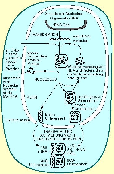 Sofort nach der Transkription binden ribosomale Proteine (welche im Cytoplasma synthetisiert und dann via Kernporen importiert wurden) an die rRNAs. Die beiden Untereinheiten eines Ribosoms werden so noch im Nucleolus Stück für Stück zusammengesetzt. Der letzte Schritt der Ribosomenreifung findet aber erst statt, wenn die Untereinheiten ihren Arbeitsplatz, das Cytoplasma, erreicht haben. (Schema