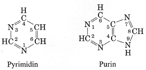 Die DNA enthält (neben Zucker und Phosphat) vier Basen, die man aufgrund ihrer Struktur in Purine und Pyrimidine unterteilt. Purine bestehen aus zwei Ringen (einem 6- und einem 5-Ring), Pyrimidine haben nur einen Ring, den 6-Ring.