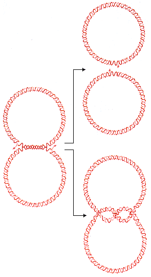Oft beobachtet man aber eine weitergehende DNA-Synthese mit der Ausbildung von Catenanen (ineinander verhängte Ringe). Zur Auflösung der Catenane und zur Freisetzung der replizierten DNA ist die Typ-II-Topoisomerase notwendig (Mechanismus)