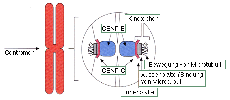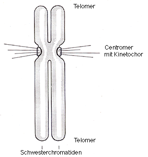 Mitosechromosomen (Abb. unten), d.h. maximal kondensierte Metaphasen-Chromosom, bestehen wegen der bereits erfolgten DNA-Verdoppelung aus zwei Chromatiden, welche bis zu ihrer Trennung in der Mitose am Centromer zusammenhängen. Die kürzeren Abschnitte werden mit p, die längeren mit q bezeichnet. Am Centromer binden Proteine, welche das sogenannte Kinetochor (Abb. unten) bilden, die Ansatzstelle für die Spindelfasern. Centromer und Kinetochor wurden früher als Synonyme gehandelt, jetzt weiss man aber, dass es sich um verschiedene Strukturen handelt. Die Enden eines Chromosoms nennt man Telomere.