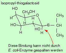 Ausser Lactose können mehrere andere Galactoside die Synthese der drei Proteine induzieren, darunter sind auch solche Galactoside, die von der b-Galactosidase nicht gespalten werden können. Der stärkste Induktor, Isopropyl-b-D-thiogalactosid (IPTG), gehört zu dieser Gruppe von Galactosiden.