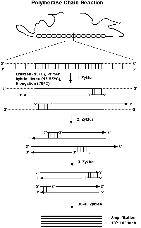 Bedeutung: Die Einführung der PCR-Methode Ende der 80er Jahre hat die Anwendungsmöglichkeiten der Gentechnologie revolutioniert. Sie ermöglicht die massive Vermehrung (Amplifizierung) kleinster DNA-Mengen, die sonst der Analyse nicht oder nur schwer zugänglich wären.