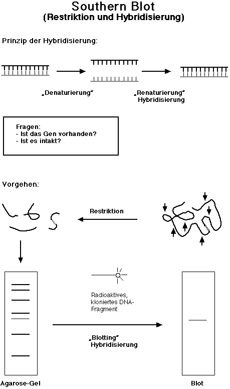 Southern Blotting ist eine Methode zur Uebertragung von DNA-Banden aus einem Gel auf eine Membran aus Nitrozellulose oder aus einem ähnlichen Material.