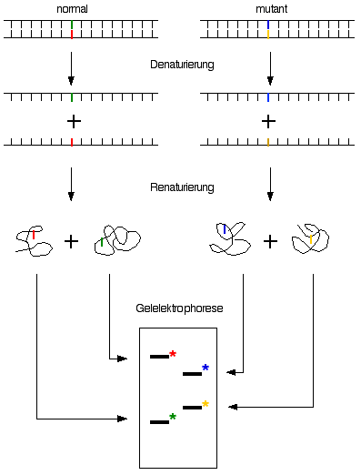 - Prinzip: DNA-Einzelstränge falten auf sich selber zurück und bilden eine Struktur, welche für jede Basensequenz einmalig ist. Unterschiedlich gefaltete DNA-Stränge können mittels Gelelektrophorese getrennt werden.