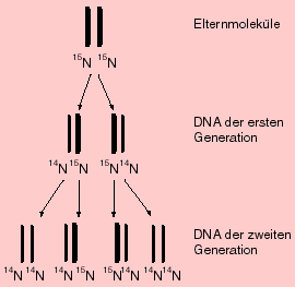 Matthew Meselson und Franklin Stahl zeigten1957, dass die DNA-Replikation semikonservativ verläuft. Sie züchteten E. coli Zellen über mehrere Generationen auf einem künstlichen Nährboden, welcher als Stickstoffquelle das "schwere" Stickstoff-Isotop 15N an Stelle des "leichten" Isotopes 14N enthielt.