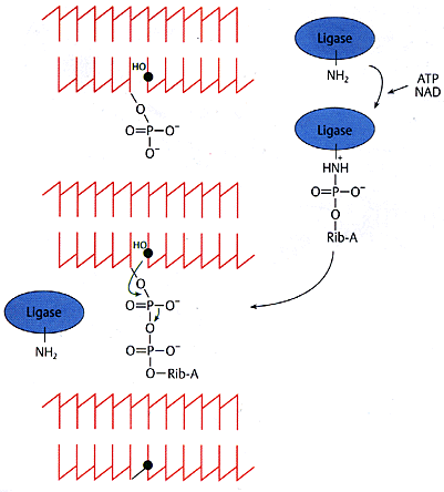 Ihre Funktion ist dieselbe, sie unterscheiden sich aber im Cofaktor. Während die Bakterien-Ligase NAD als Cofaktor benötigt, ist der Cofaktor von Eukaryonten-Ligasen ATP. Mechanismus:
