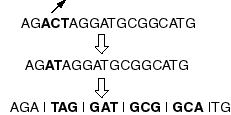 Versuchen Sie herauszufinden, in welchen Fällen Deletion oder Insertion von Basen zu keiner frame-shift-Mutation führt. |