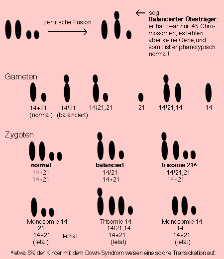 Zeichnen Sie eine Zentrische Fusion der Chromosomen 14 und 21 auf. Wie sieht die Chromosomenverteilung bei der Gametogenese