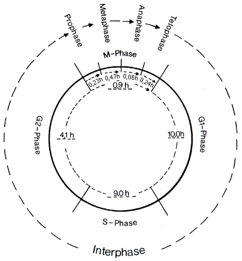 M-Phase (3-4 h): Die Mitose-Phase wird weiter in sechs Stadien unterschiedlicher Länge unterteilt: Prophase, Prometaphase, Metaphase, Anaphase, Telophase und Cytokinese.
