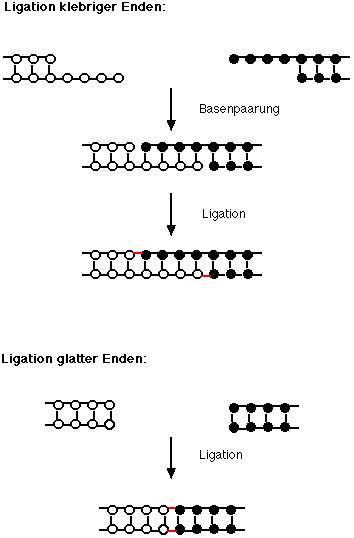 DNAs mit komplementären einzelsträngigen Enden können über diese Basenpaarung eingehen. Sie werden deshalb als kohäsiv oder klebrig bezeichnet. Ueber diese Enden können DNAs durch die DNA-Ligase fest verbunden werden. Die DNA-Ligase katalysiert die Bildung neuer Phosphodiesterbrücken.