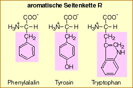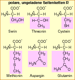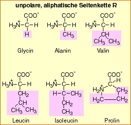 AS unterteilt man häufig nach den chemischen Eigenschaften der Seitenkette in fünf Hauptklassen: es gibt unpolare und aliphatische, aromatische, polar-ungeladene, polar-negativ geladene und polar-positiv geladene AS: