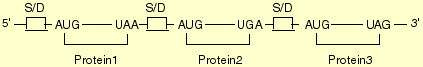 Jeder Abschnitt besteht aus einer Ribosomenbindungsstelle (Shine-Dalgarno-Sequenz, S/D) und einem Start- und einem Stop-Codon (UAA, UAG oder UGA), welche den zu translatierenden Bereich begrenzen (ein Codon ist ein Basentriplett. Näheres dazu: siehe Kapitel "Der genetische Code").