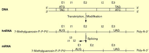 Das primäre Transkript erhält durch Übertragung von GTP und Methylierung von Guanin in Position 7 eine Cap-Struktur am 5'-Ende und einen Poly-A-Schwanz am 3'-Ende. Die so modifizierte RNA nennt man hnRNA (heterogene nukleäre RNA) oder auch "pre-messenger-RNA". Diese Vorläufer-RNA reift im Kern durch Splicing zur eigentlichen mRNA, bei welcher die nicht-kodierenden Abschnitte (Introns) entfernt sind: