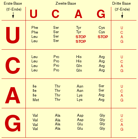 In der Translation wird die Basensequenz der mRNA in die Aminosäurensequenz eines Proteins übersetzt: Immer drei aufeinanderfolgende Basen bilden ein Codewort. Der genetische Code ist also eine Schrift aus 4 "Buchstaben" (den vier Basen Adenin, Guanin, Cytosin und Uracil), mit denen "Wörter" aus 3 Buchstaben Länge gebildet werden können. Es sind somit 4 hoch 3 = 64 verschiedene Basentripletts oder Codons möglich (Achtung: in der Abbildung fehlt UGG=Tryptophan):