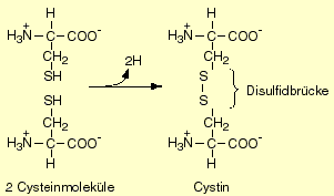 3. Die Tertiärstruktur ist die dreidimensionale Konformation eines Proteins: sie beschreibt die Lage aller Atome im Raum. Zusammengehalten wird die Tertiärstruktur durch eine Vielzahl von Wechselwirkungen zwischen verschiedenen Aminosäuren. Bei diesen Kräften handelt es sich um Wasserstoffbrückenbindungen, Ionenbindungen zwischen positiv und negativ geladenen Gruppen der Seitenketten, hydrophobe Bindungen im Innern der Proteine und Disulfidbrücken, die durch Dehydrierung (Oxidation) von zwei SH-Gruppen zweier Cystein-Reste entstehen:
